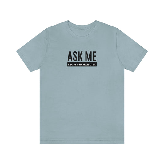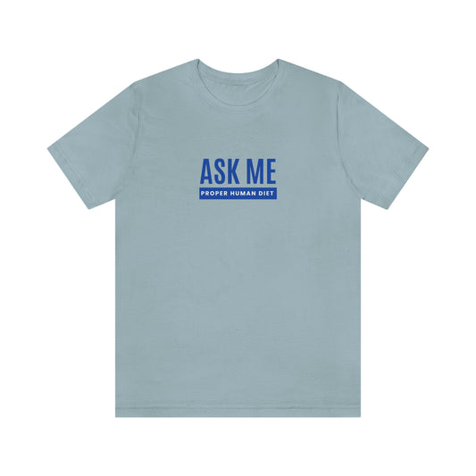 ASK ME PROPER HUMAN DIET - Light Colored T - Blue Lettering - on front